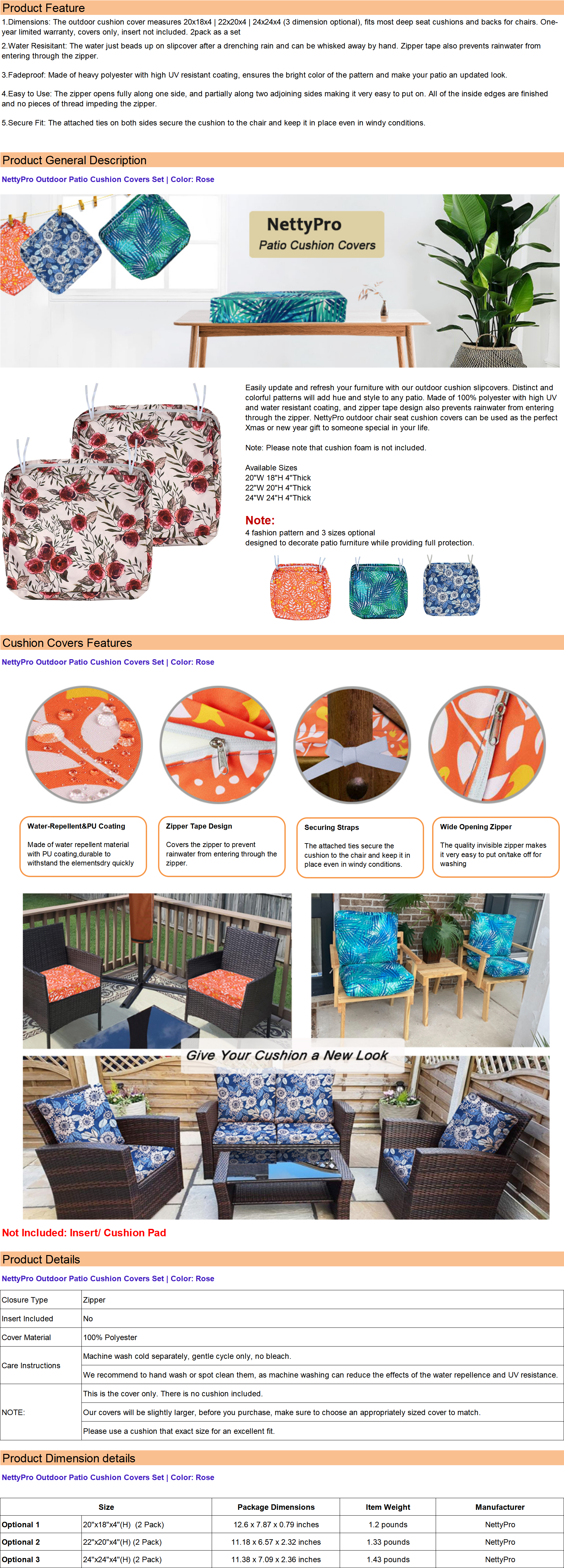 - NettyPro Outdoor Chair Seat Cushion Covers 2 Pack a set,rose cover 20" 22" 24" inch Water Repellent UV Resistant Patio Cushion Slipcovers, 20x18x4 | 22x20x4 | 24x24x4 Inch