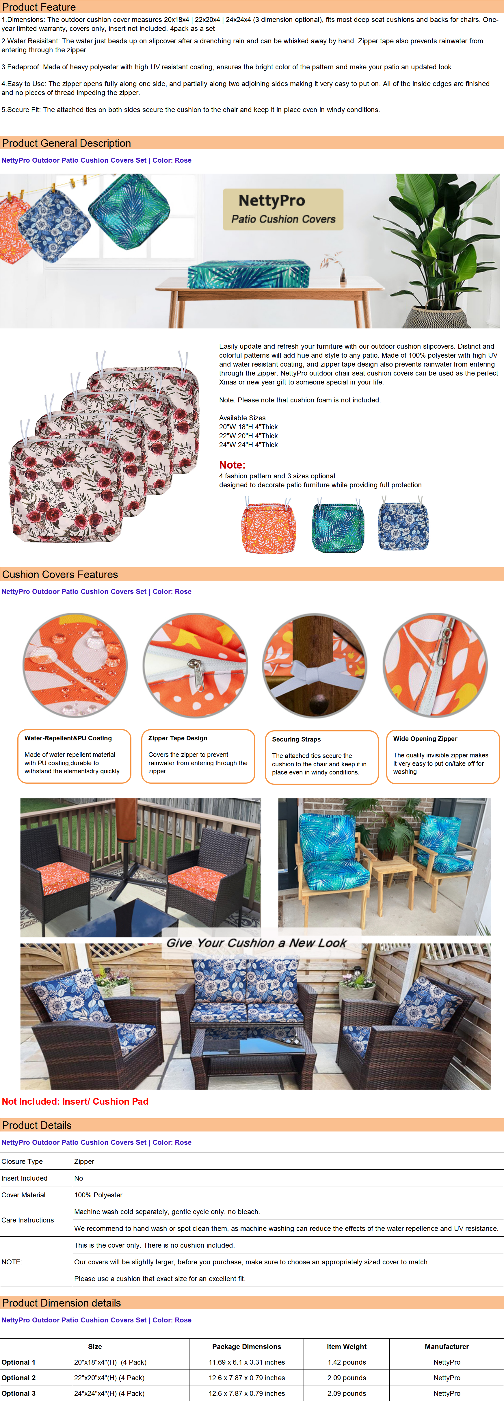 - NettyPro Outdoor Chair Seat Cushion Covers 4 Pack a set,rose cover 20" 22" 24" inch Water Repellent UV Resistant Patio Cushion Slipcovers, 20x18x4 | 22x20x4 | 24x24x4 Inch