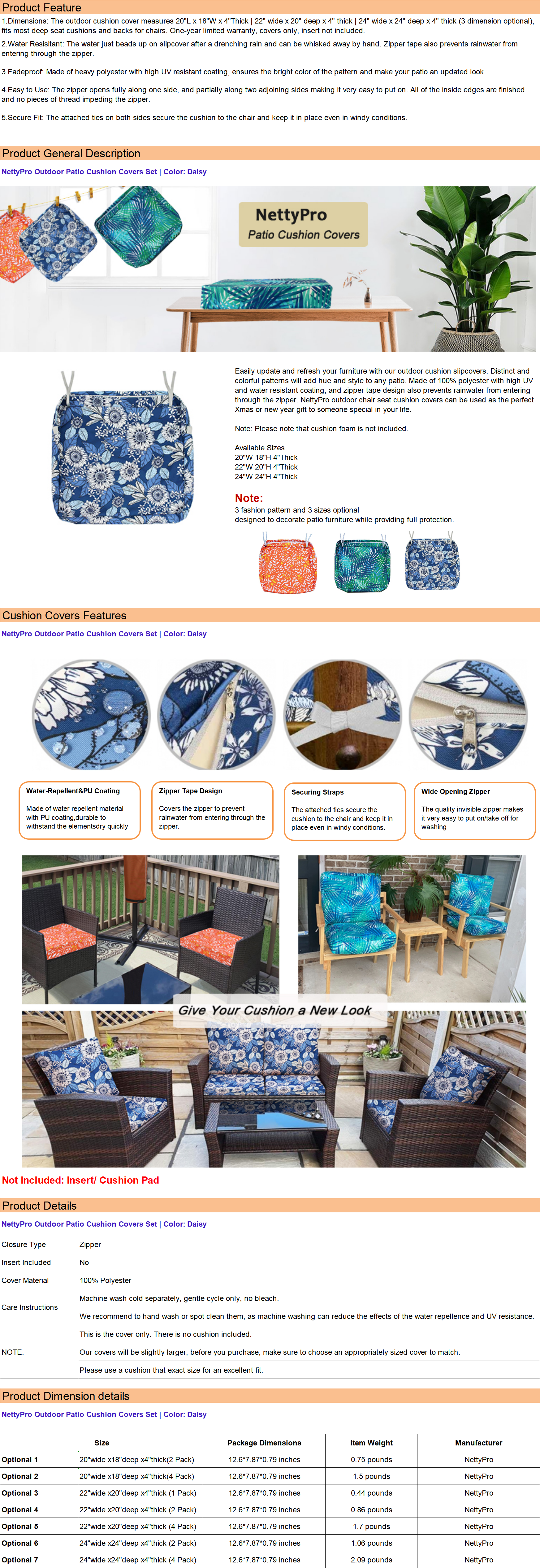 - Nettypro Patio Cushion Cover Daisy 20" 22" 24" Water Repellent UV Resistant Outdoor Chair Seat Cushion Slipcover 20 x 18 x 4 Inch | 22 x 20 x 4 Inch | 24 x 24 x 4 Inch