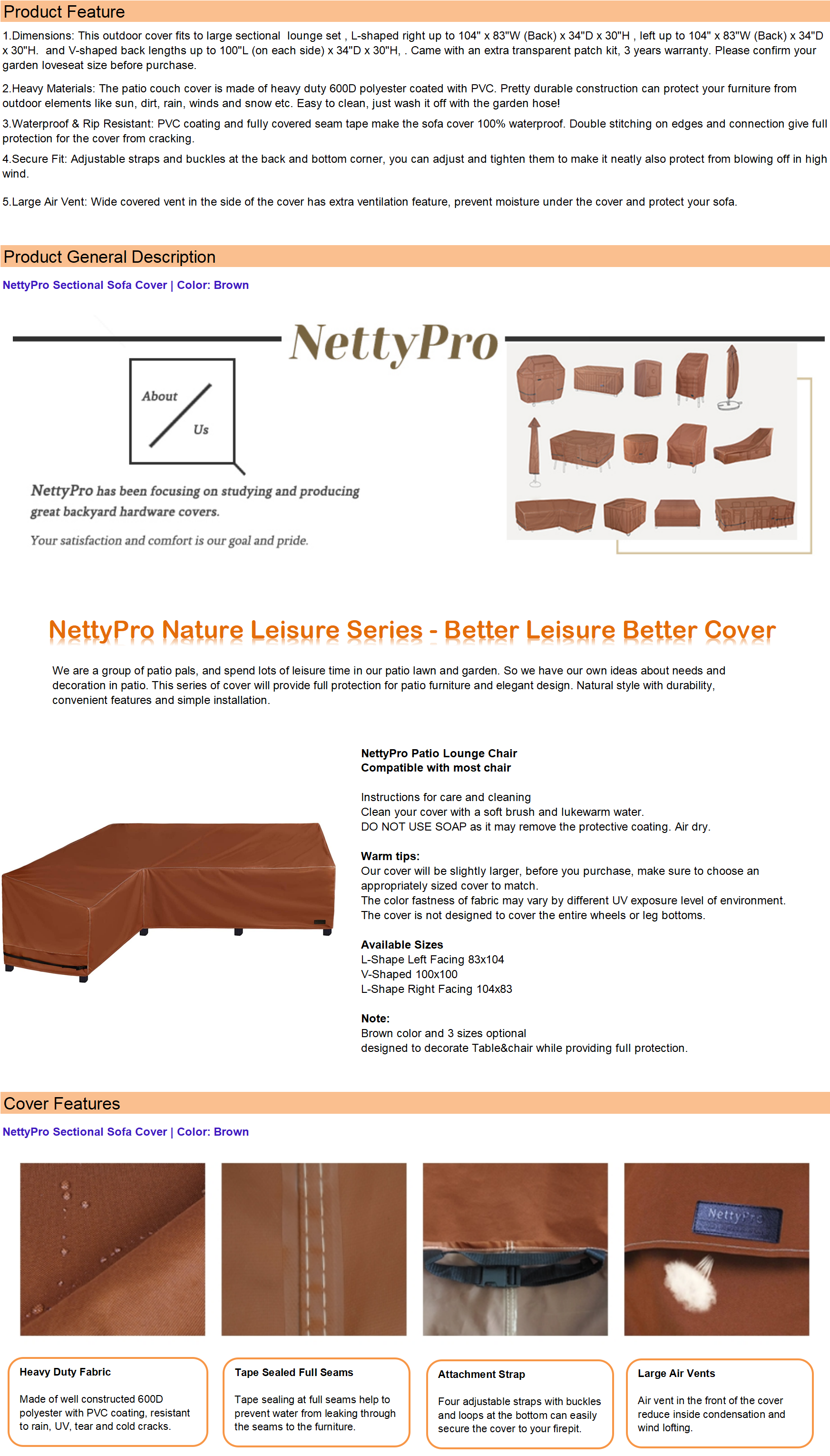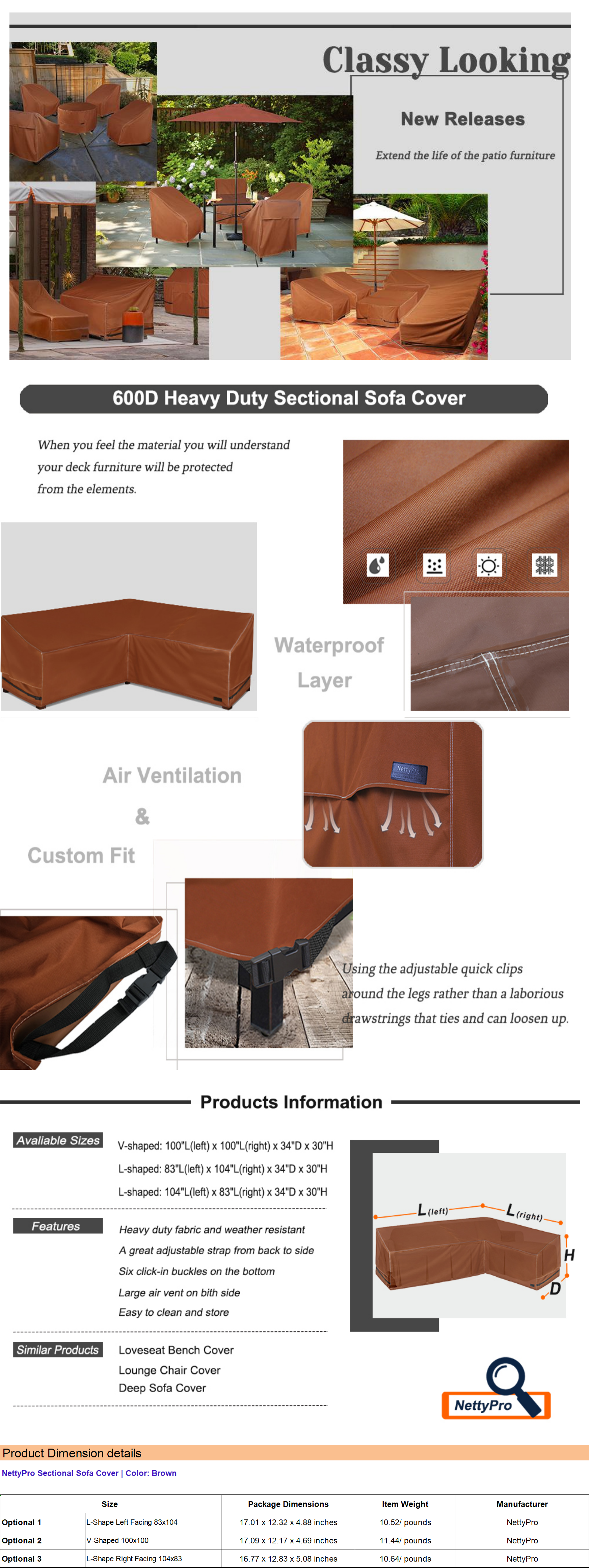 - NettyPro Waterproof Patio Sectional Sofa Cover 600D Heavy Duty Waterproof Patio Lawn Furniture Lounge Set Couch Cover, 83 x 104 | 100x100 | 104x83 Inch, L-Shaped Left Facing ,L-Shape Right Facing,V-Shaped optional