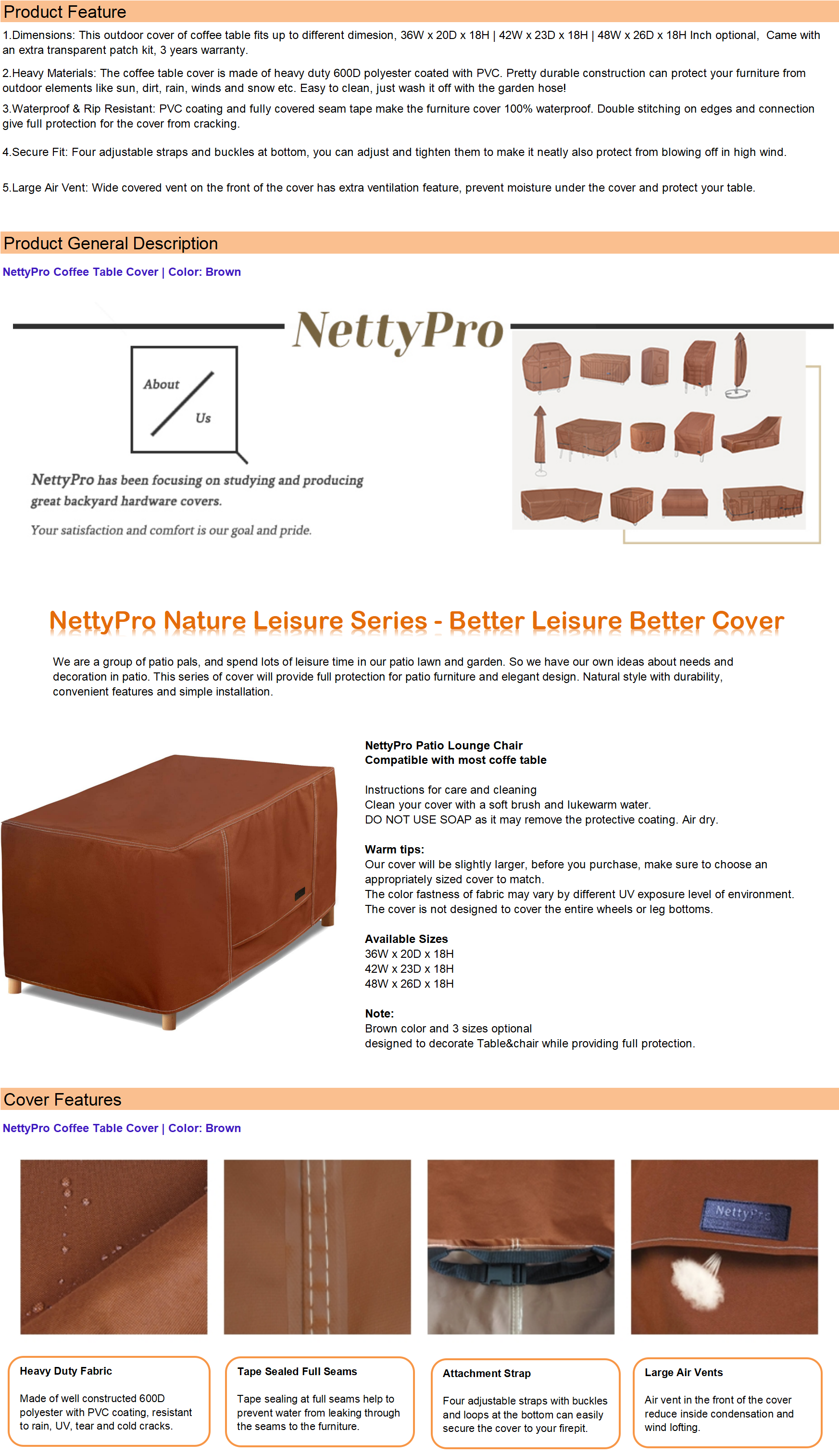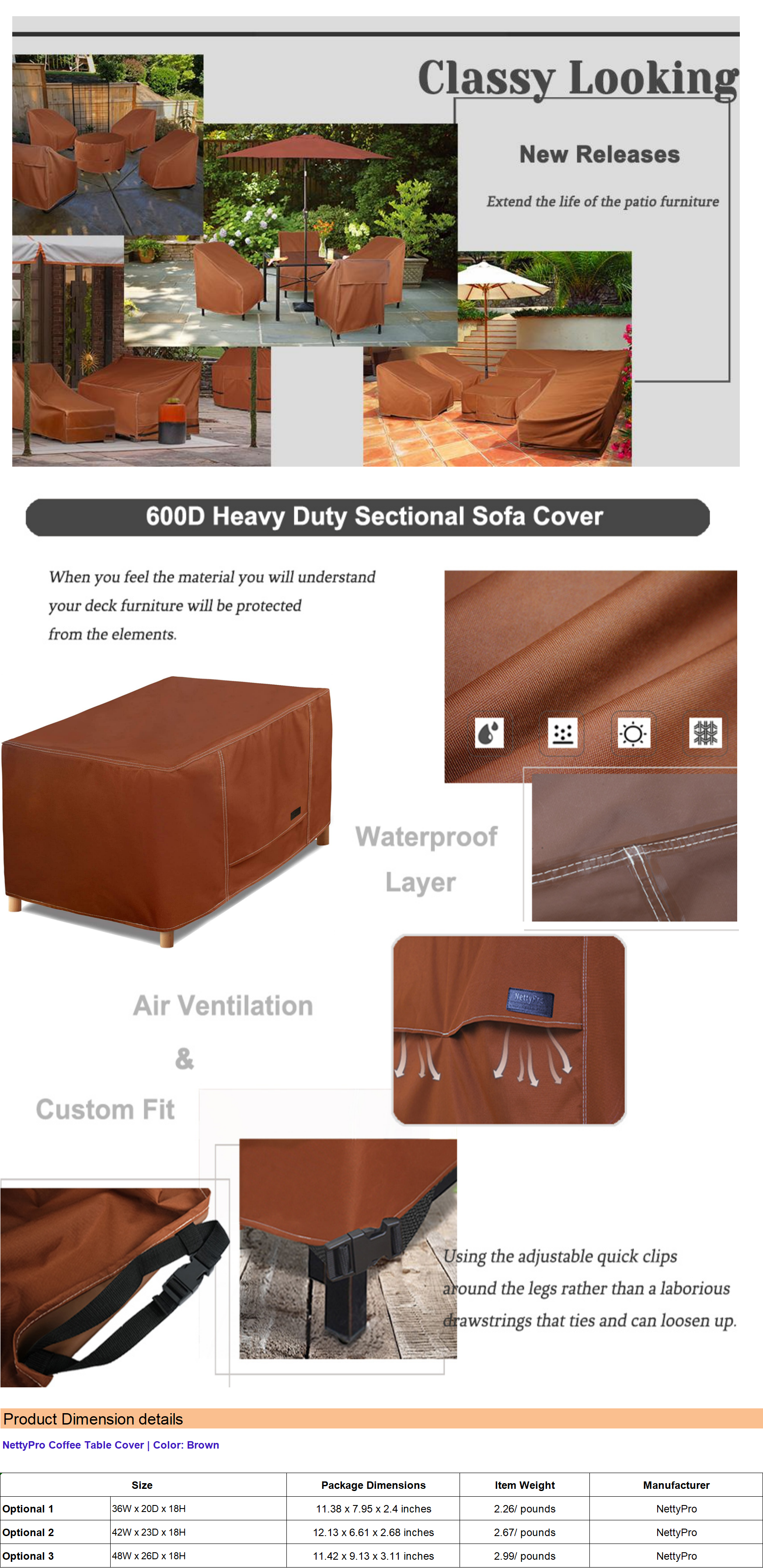 - NettyPro Waterproof Heavy Duty Outdoor Patio Coffee Table Cover Rectangular 36W x 20D x 18H | 42W x 23D x 18H | 48W x 26D x 18H Inch, Brown color