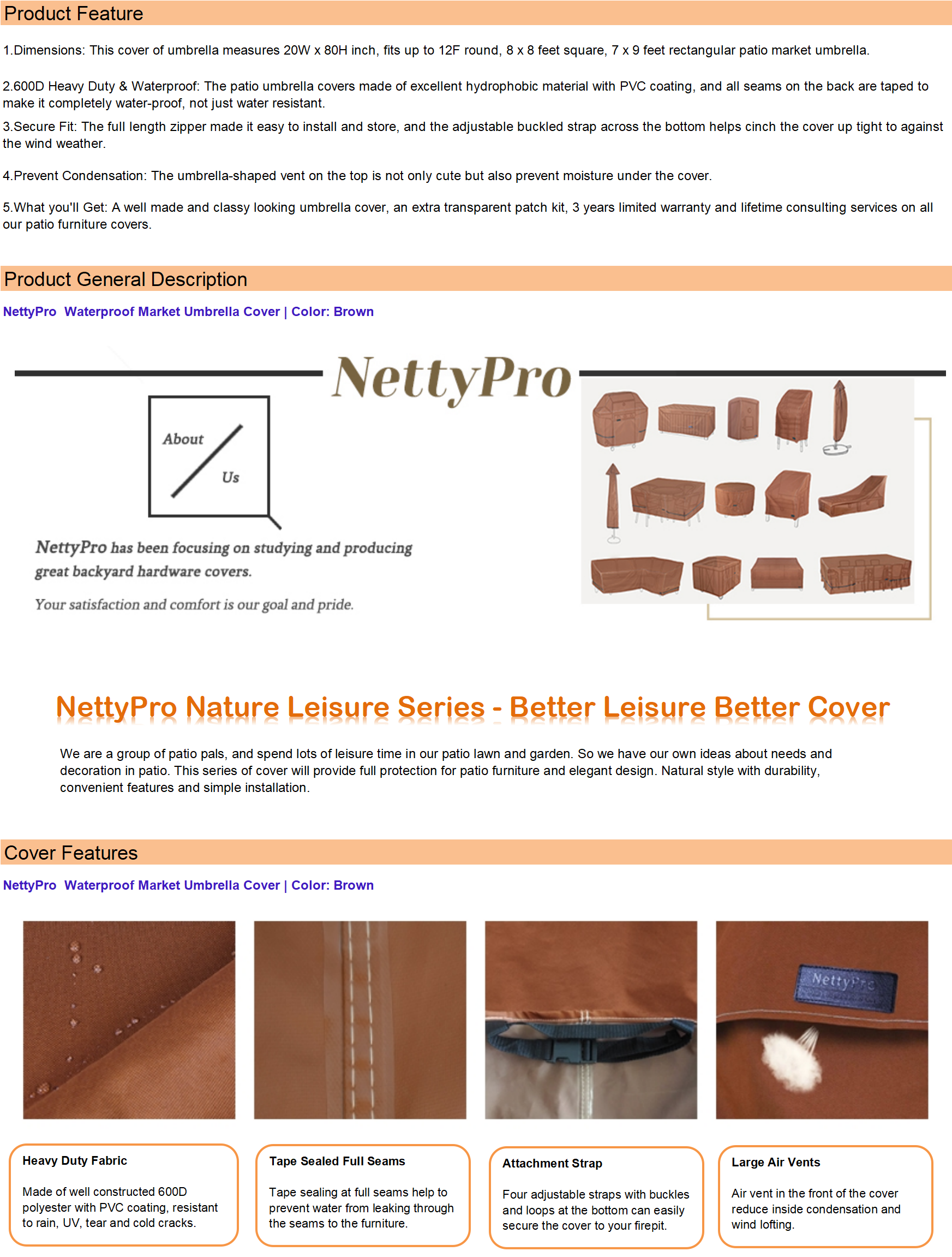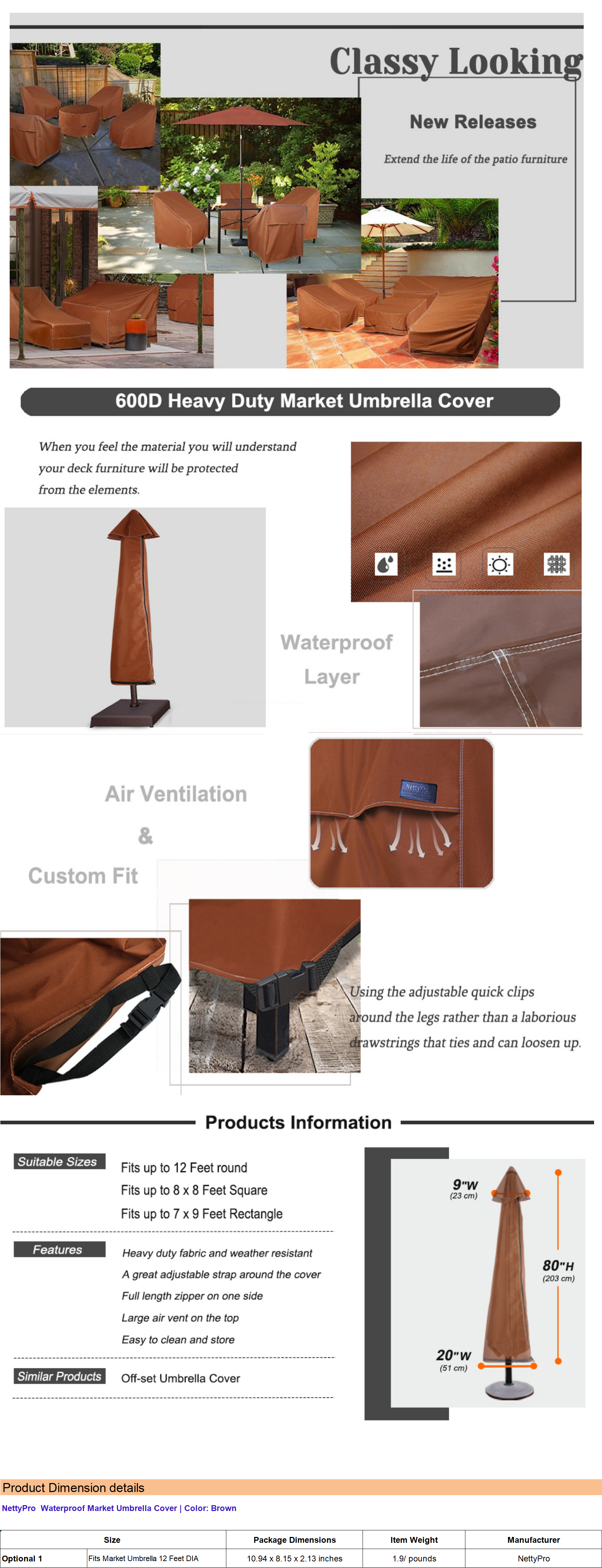 - NettyPro Umbrella Cover Outdoor Patio Waterproof Market Umbrella Cover Up to 12 Feet Outdoor Umbrella, Brown